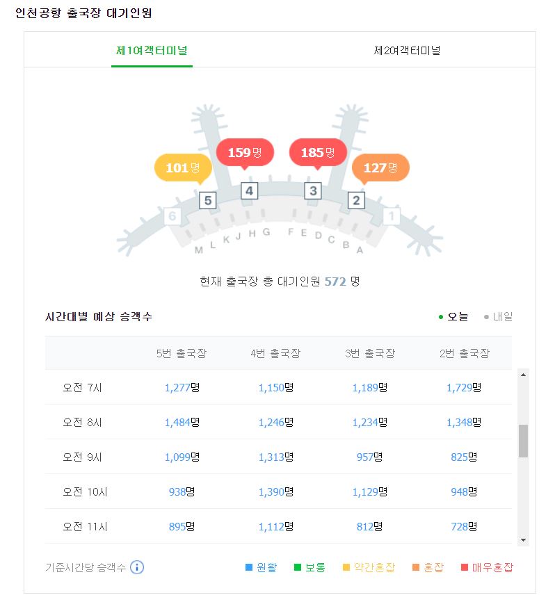 이 표를 보면 2~5번 출국장의 기준 시간당 승객 수를 색깔로 구분해 어느 출국장이 붐비는지 확인할 수 있다. (1번, 6번 출국장은 패스트 트랙으로 예상 승객수에서 제외) 항공권을 보고 출국 터미널과 탑승 게이트를 확인한 후, 가장 가깝고 덜 붐비는 출국장으로 찾아가면 될 것이다.