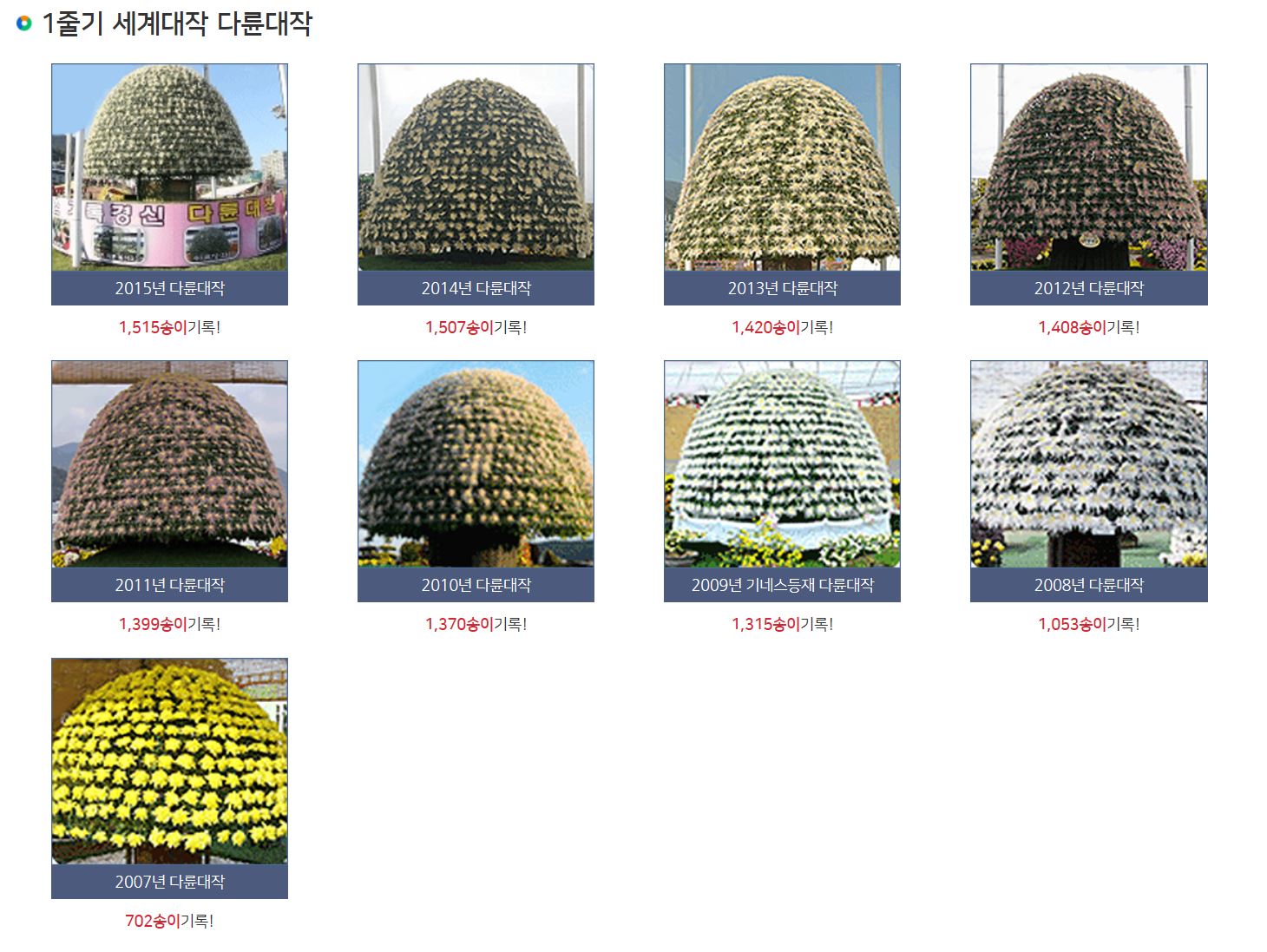 다륜대작에 대해 간단하게 소개를 하자면, 제 9회 가고파국화축제에서 선보였던 '천향여심 다륜대작'은 국화 한 줄기에서 1315송이의 국화 꽃을 피운 세계최대 다륜대작 작품으로 2010년 1월 19일 영국 기네스 기록으로부터 세계기록으로 공식인정을 받았습니다. 2010년에는 국화재배 전문가 300여명이 16개월 동안 지극정성으로 기를 모아 여섯 차례 화분갈이와 순 자르기 10회를 거쳐 국화 한 줄기에서 1370송이의 꽃을 피운 지름 2.8미터, 높이 2.6미터의 작품을 선보였다고 합니다~