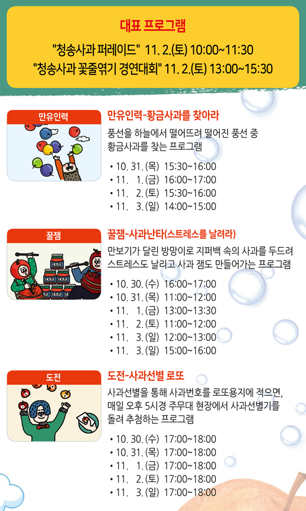방문객 남녀노소 누구나 쉽게 참여하고 즐길 수 있는 하늘에서 떨어지는 수천개의 사과풍선 중 황금사과를 찾는 "만유인력-황금사과를 찾아라", 사과선별을 통해 로또 번호를 추첨하는 "도전 사과선별 로또", 만보기가 달린 방망이로 최고의 난타꾼을 뽑는 "꿀잼-사과난타" 등 어느 축제에서도 느껴볼 수 없는 체험프로그램이 운영됩니다.