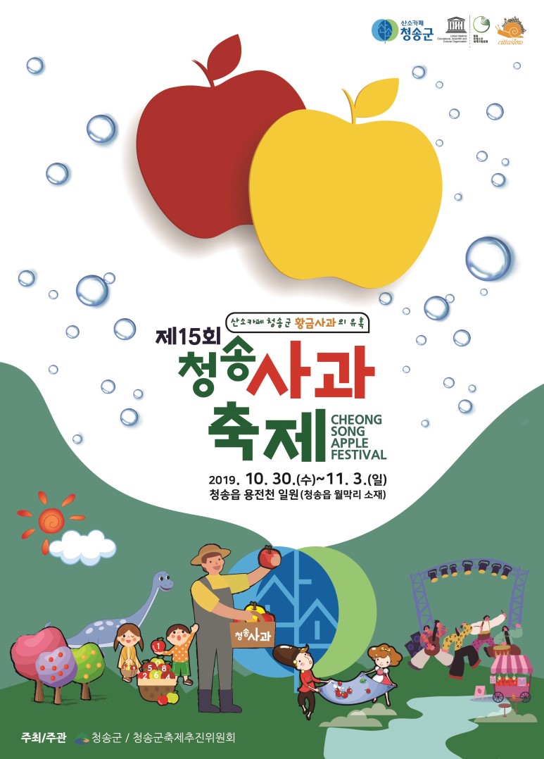 2019년도 청송사과축제는 10월30일(수) ~ 11월3일(일)까지 5일간 청송읍 용전천(현비암 앞) 일원에서 "산소카페 청송군, 황금사과의 유혹"을 주제로 개최됩니다.