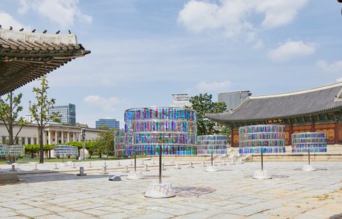 덕수궁의 법전인 중화전 앞에서는 ‘2018년 오늘의 젊은 예술가상’ 건축부분을 수상한 OBBA의 '대한연향'을 만날 수 있습니다. 1902년 중화전 앞마당에서 대한제국의 마지막 전통 연회 '연향'이 열렸는데, 이 연향에서는 햇빛과 바람 등을 막아주는 가리개로 만인산과 천인산이 사용되었습니다. OBBA는 만인산과 천인산이라는 가리개에서 ‘사용자의 의도나 기능에 따라 공간이 창출되는 변화의 가능성’을 포착했고, 여기에서 영감을 얻어 오색 반사필름을 재료로 작품을 제작했습니다. 이 오색 반사필름이 만인산과 천인산처럼 시시각각 바람에 반응하며 매 순간 변화하는 풍경을 창출해내는 것입니다. 또한, 이는 빛과 바람의 충돌을 통해 반사와 투과를 끊임없이 반복하는, 충돌을 위한 매개체가 됨으로써 오늘날 요구되는 유연한 사고, 가치, 공간을 암시하고 있습니다.
