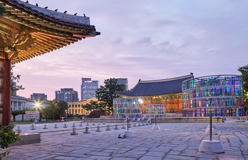 태국에서 처음 디자인 회사를 설립했다가 현재는 세계를 무대로 활동하는 스페이스 파퓰러는 덕수궁 광명문에서 '밝은 빛들의 문'을 선보이고 있습니다. 이들은 ‘광명문’이라는 이름에서 영감을 얻어 출입구에 빛의 스크린을 설치하고 시간에 따라 변화하는 가상의 공간을 연출해 시대에 따른 건축의 역할에 대해 질문을 던집니다. 디지털 세상에서 건축물이란 하나로 연결된 플랫폼이자 대중에게 열려있음을, 누구나 새로운 궁궐(세상)의 문으로 들어가고 나올 수 있음을 시사합니다.