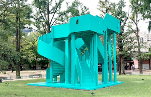 캐나다 건축가이자 2014년 베니스 건축 비엔날레 대만관의 대표 작가로 뽑힌 뷰로 스펙타큘러(히메네즈 라이)는 석조전 앞 궁궐 내 최초의 서양식 정원에서 <미래의 고고학자>를 선보입니다. 작가는 시간의 흐름에 따라 먼지와 흙이 쌓여 지층이 만들어진다는 점에 착안해 계단이라는 ‘미래의 지면’을 만들었습니다. 공중에 띄워진 이 땅덩어리가 ‘몇 세기 뒤에서 볼 수 있는 일상’이라고 말하며 이곳에 오르면 현재인 2019년을 과거처럼 바라볼 수 있다고 가정한 것입니다. 따라서 <미래의 고고학자>의 계단을 오르는 것은 미래로 향하는 특별한 여정과도 같다. 특히 관람객들은 이 작품에 올라가 ‘궁궐’을 아래에서 위로 우러러보는 게 아닌, 비슷한 높이에서 바라보는 색다른 경험을 할 수 있다고 하네요~